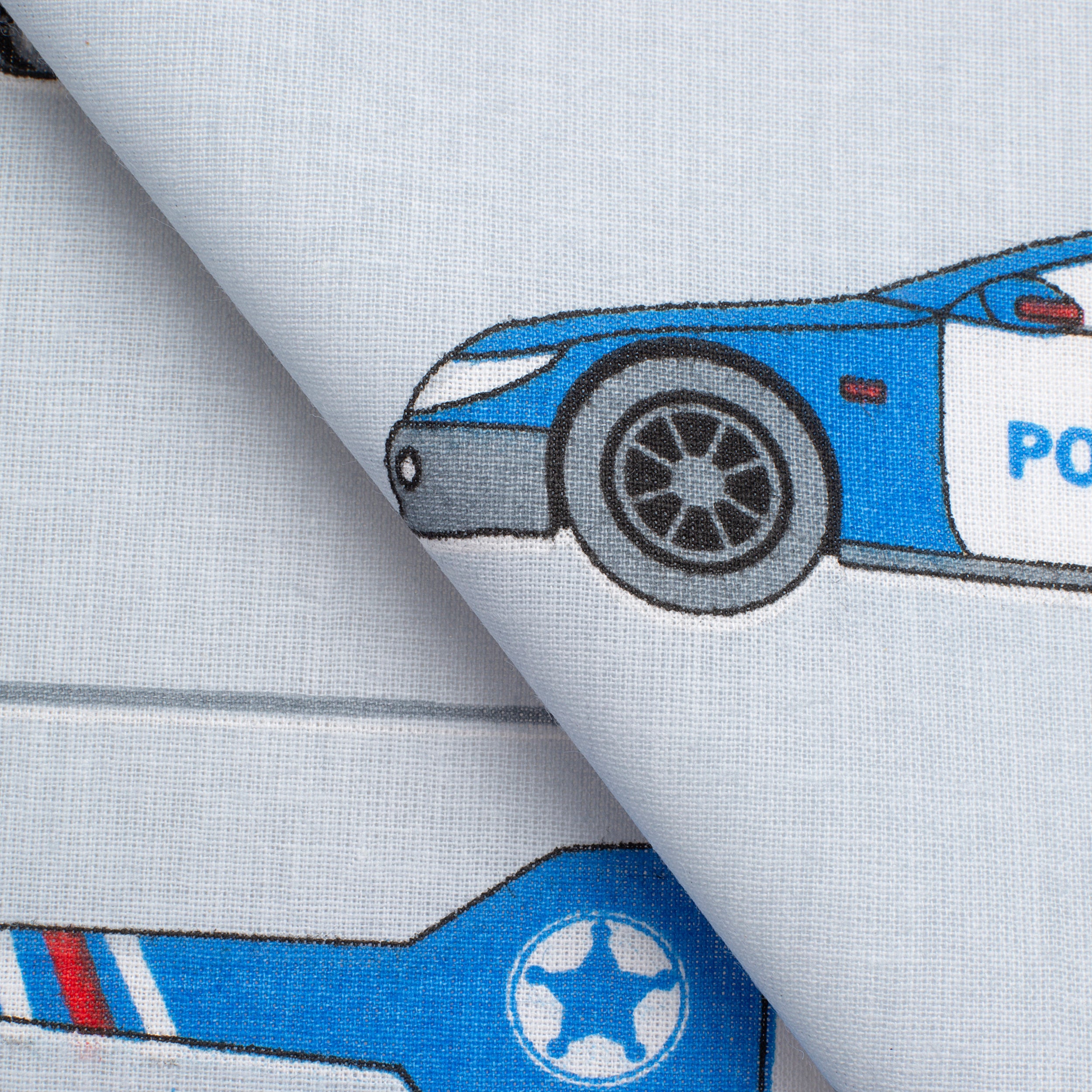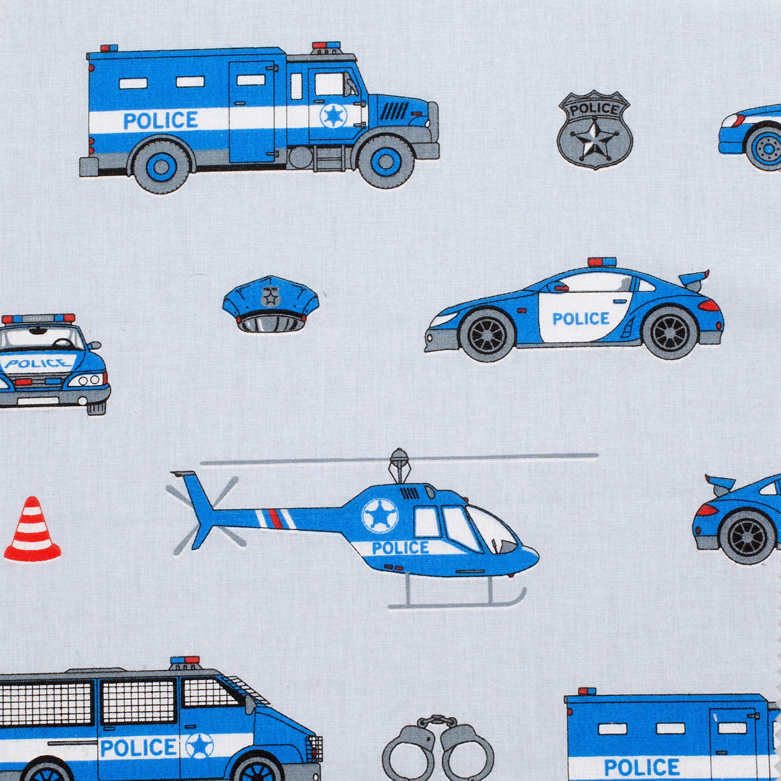 Give your projects a dynamic and thematic character with 4.2 OZ COTTON POPLIN knitted cotton fabric. On a light gray background are arranged illustrations of police cars, vans, helicopters, police caps, handcuffs, badges and traffic cones. The blue and red color scheme of the design attracts attention and gives it an energetic, modern look.