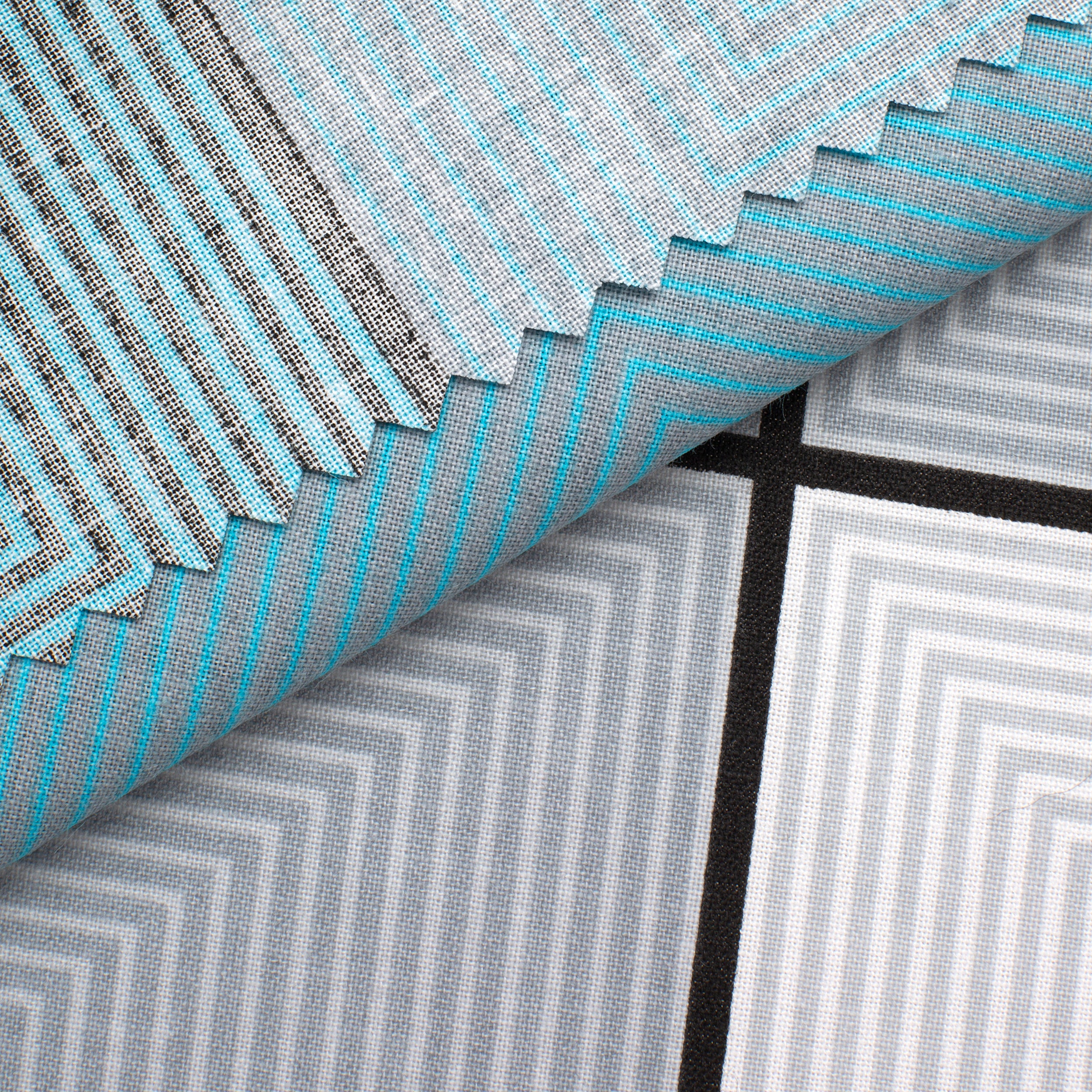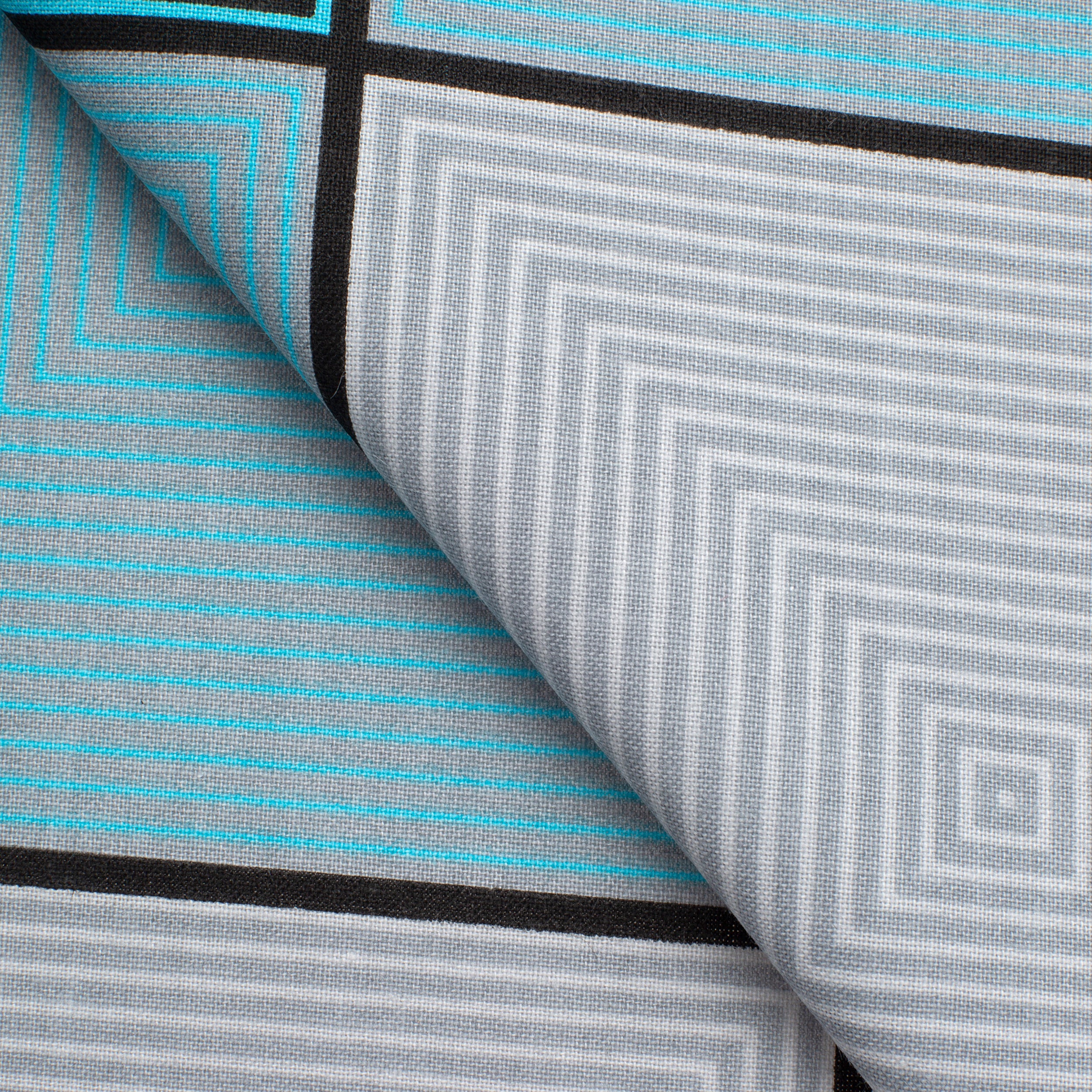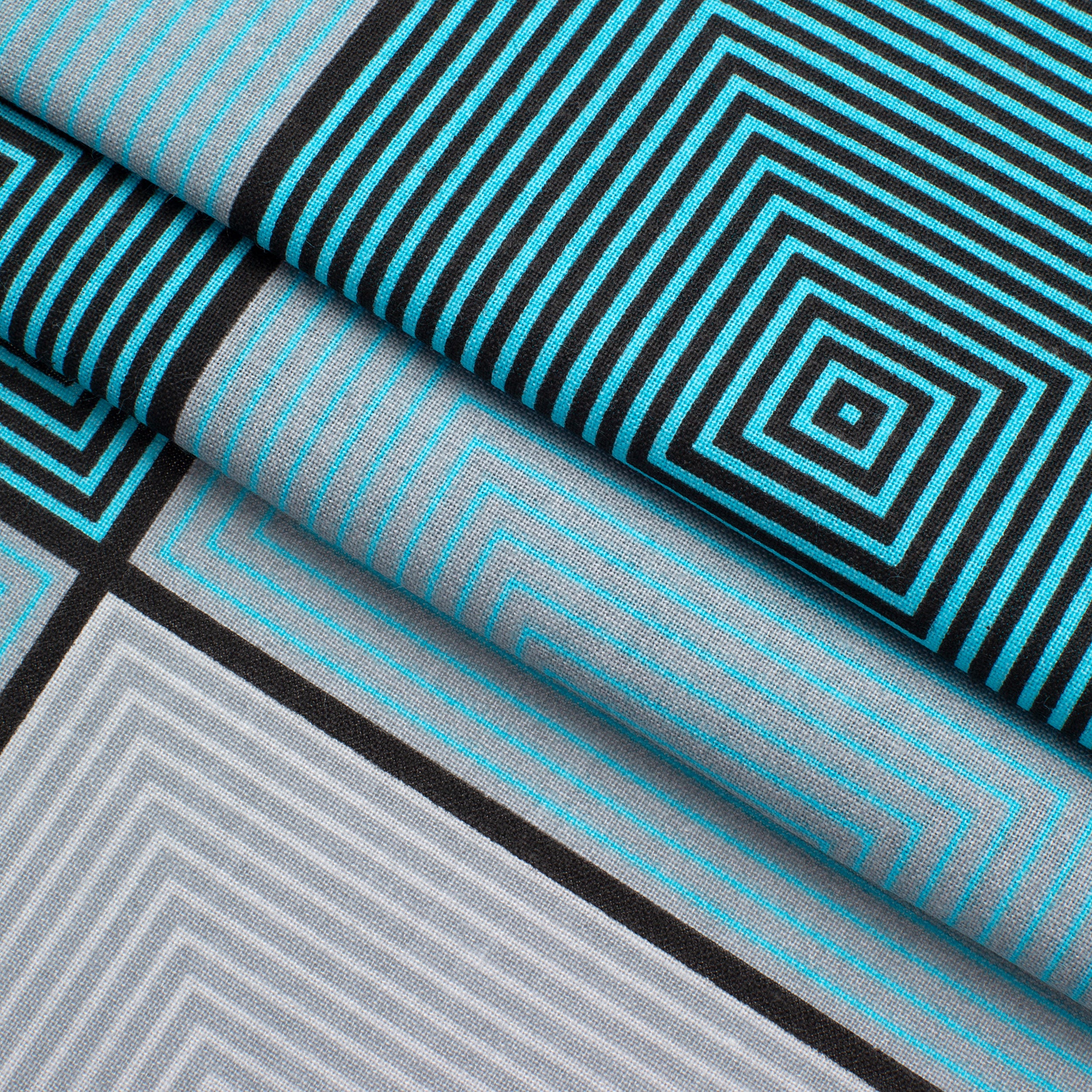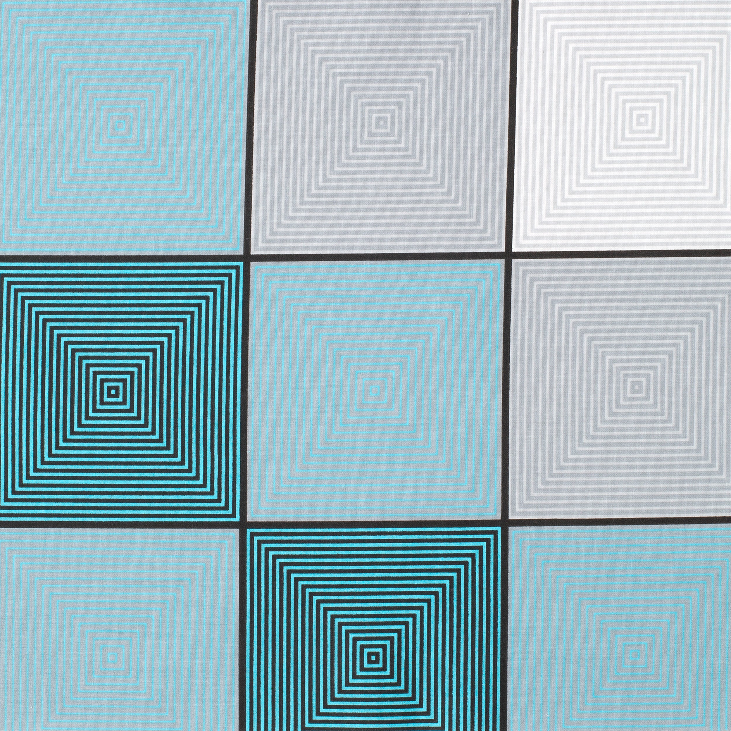 Add a modern touch to your designs with fabric 4.2 OZ COTTON POPLIN. The pattern is formed by large geometric squares in shades of turquoise, light blue and gray, some filled with concentric lines, others in solid color. This dynamic motif fits perfectly into arrangements with a contemporary, minimalist or Scandinavian style.