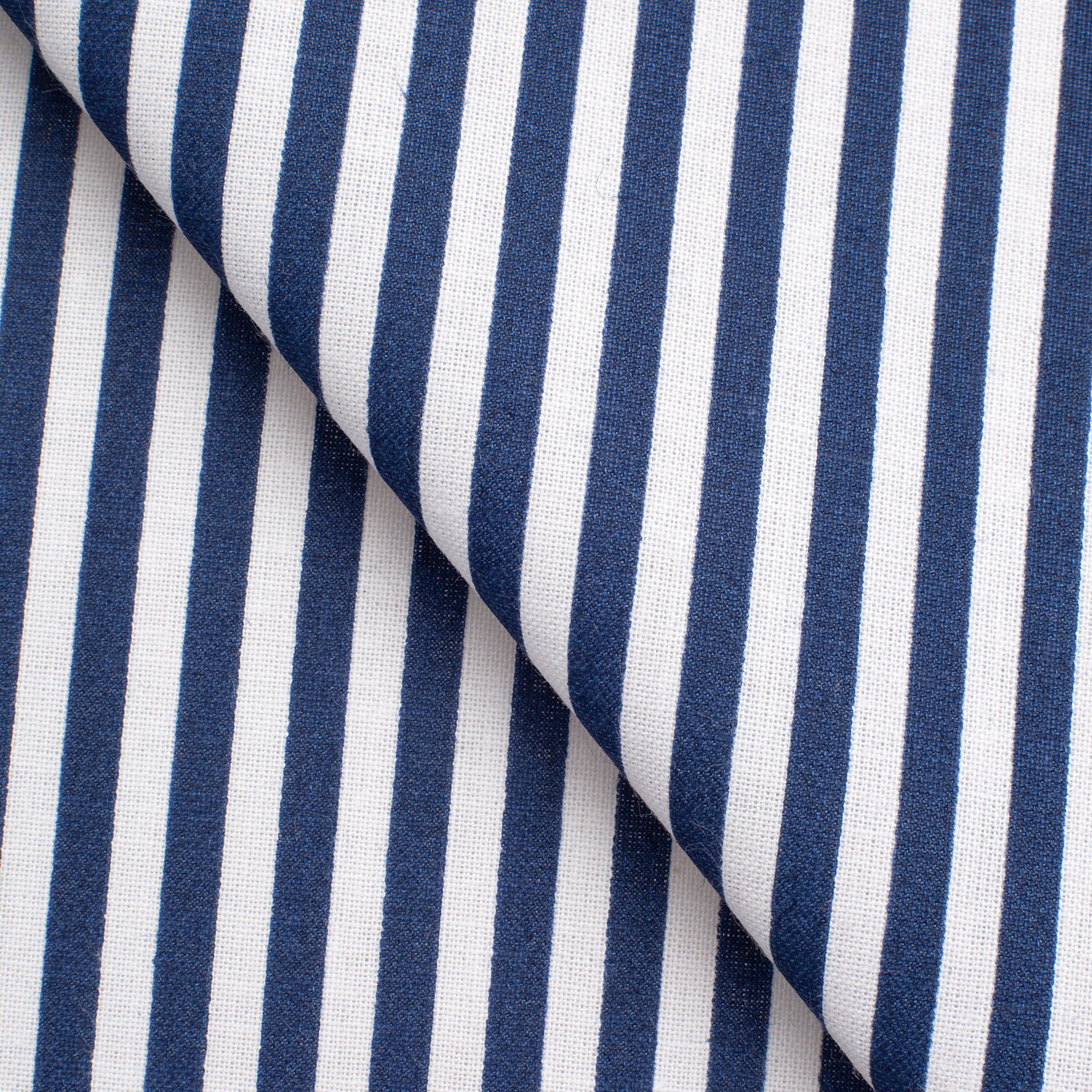 Give your designs a touch of nautical elegance with 4.2 OZ COTTON POPLIN fabric. Its classic pattern of vertical navy blue stripes on a white background is eye-catching and adds a timeless touch. It is ideal for interiors inspired by nautical, retro or minimalist style.