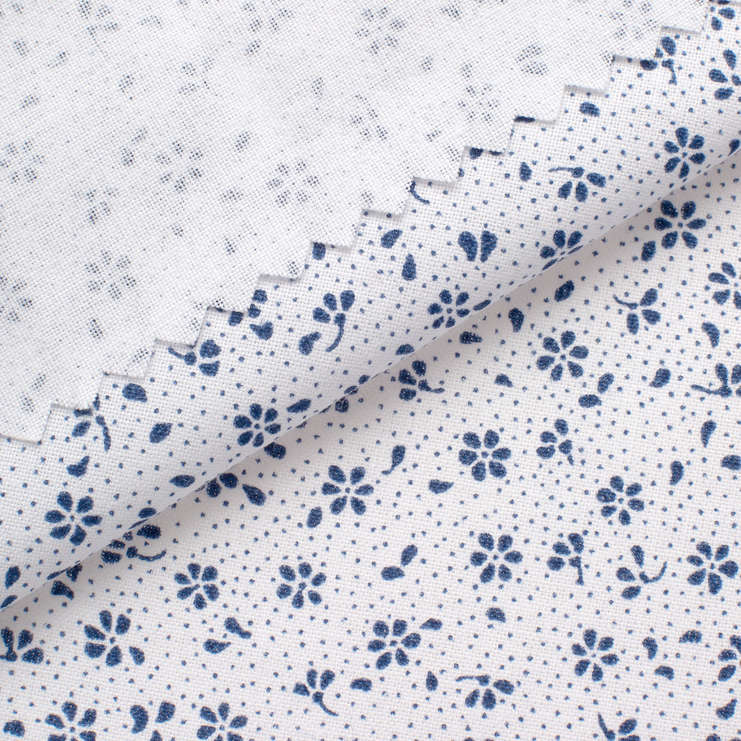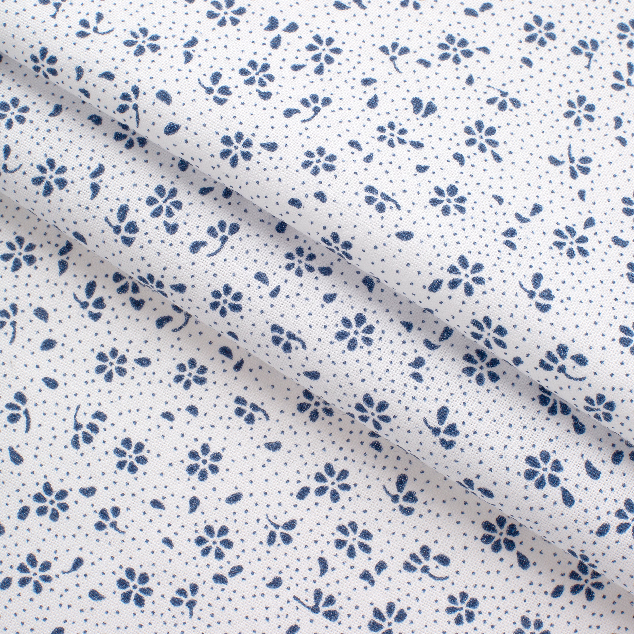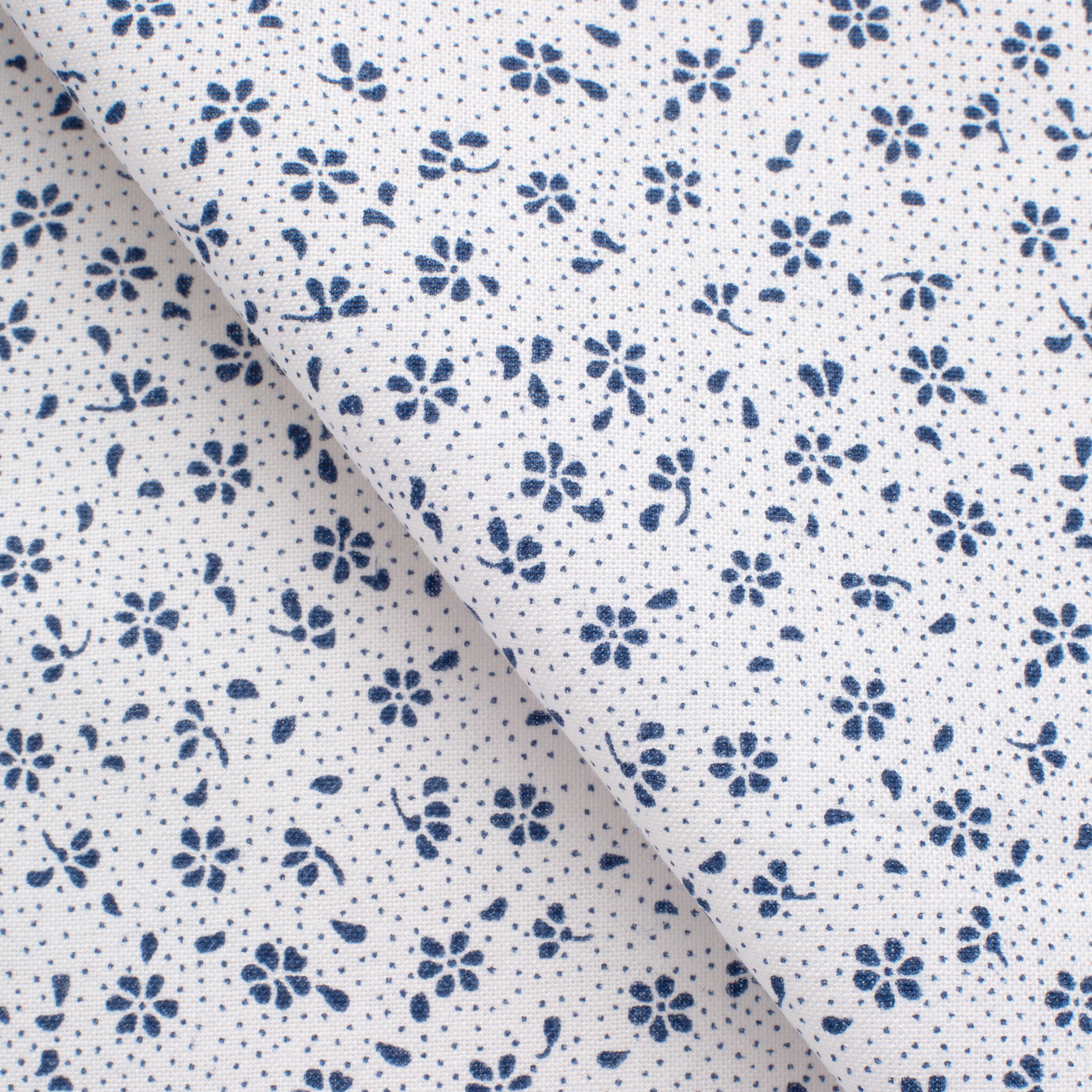 Give your designs a fresh and elegant character with 4.2 OZ COTTON POPLIN fabric. A delicate print of tiny navy blue flowers and leaves, interspersed with tiny dots, is arranged on a white background to create a light, harmonious pattern. Thanks to its subdued colors, the fabric will go well with classic, nautical or minimalist arrangements.