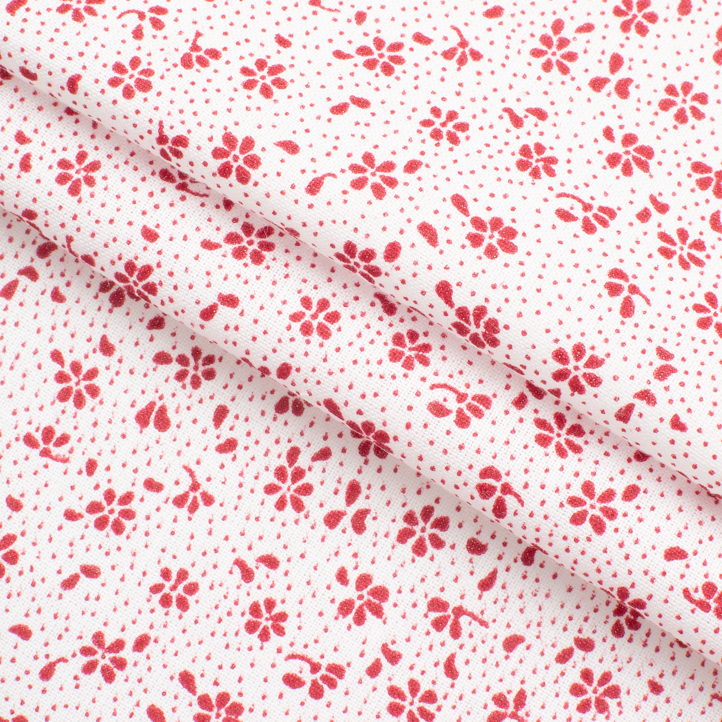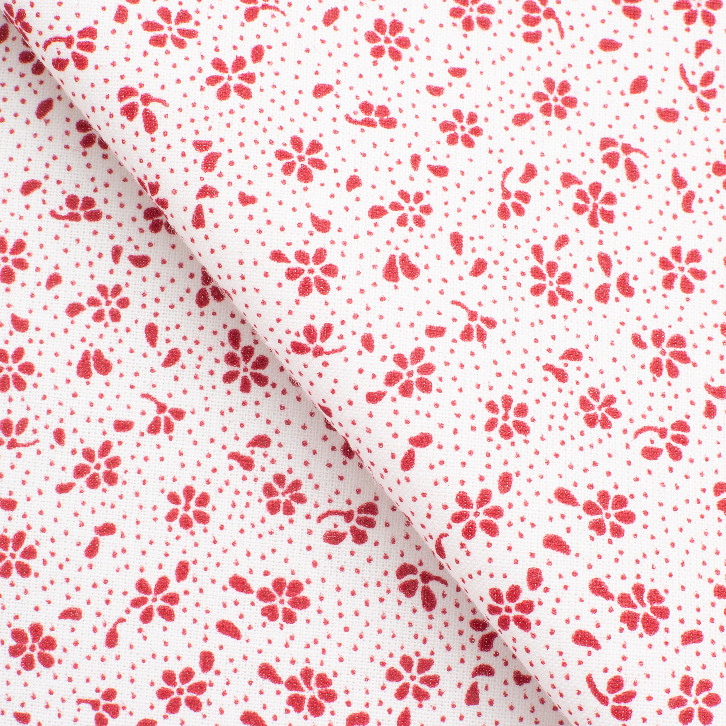 Introduce lightness and subtle elegance into your designs with 4.2 OZ COTTON POPLIN fabric. A fine print of red flowers and leaves is arranged on a white background, complemented by tiny red dots, which add a delicate and slightly vintage touch to the whole. This classic fine motif will work well in both interior decoration and closet items.