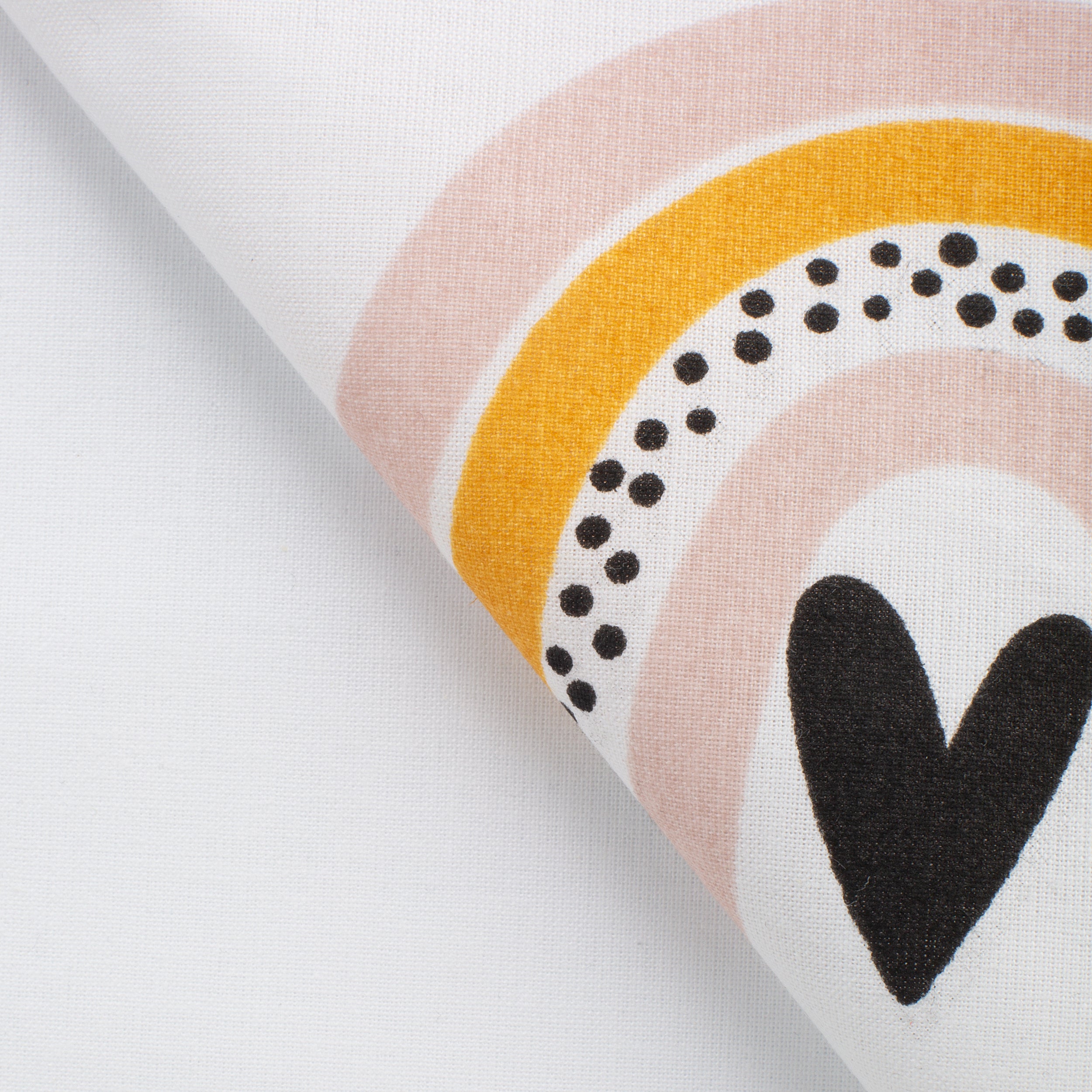 Introduce a touch of modern joy into your projects with fabric 4.2 OZ COTTON POPLIN - PRINTED - RAINBOW. A subtle pastel rainbow motif with a black heart adds a unique character to the fabric, while maintaining versatility. The fabric, with a weight of 125 g/m2 and a density of 160, guarantees durability, weave stability and resistance to deformation.