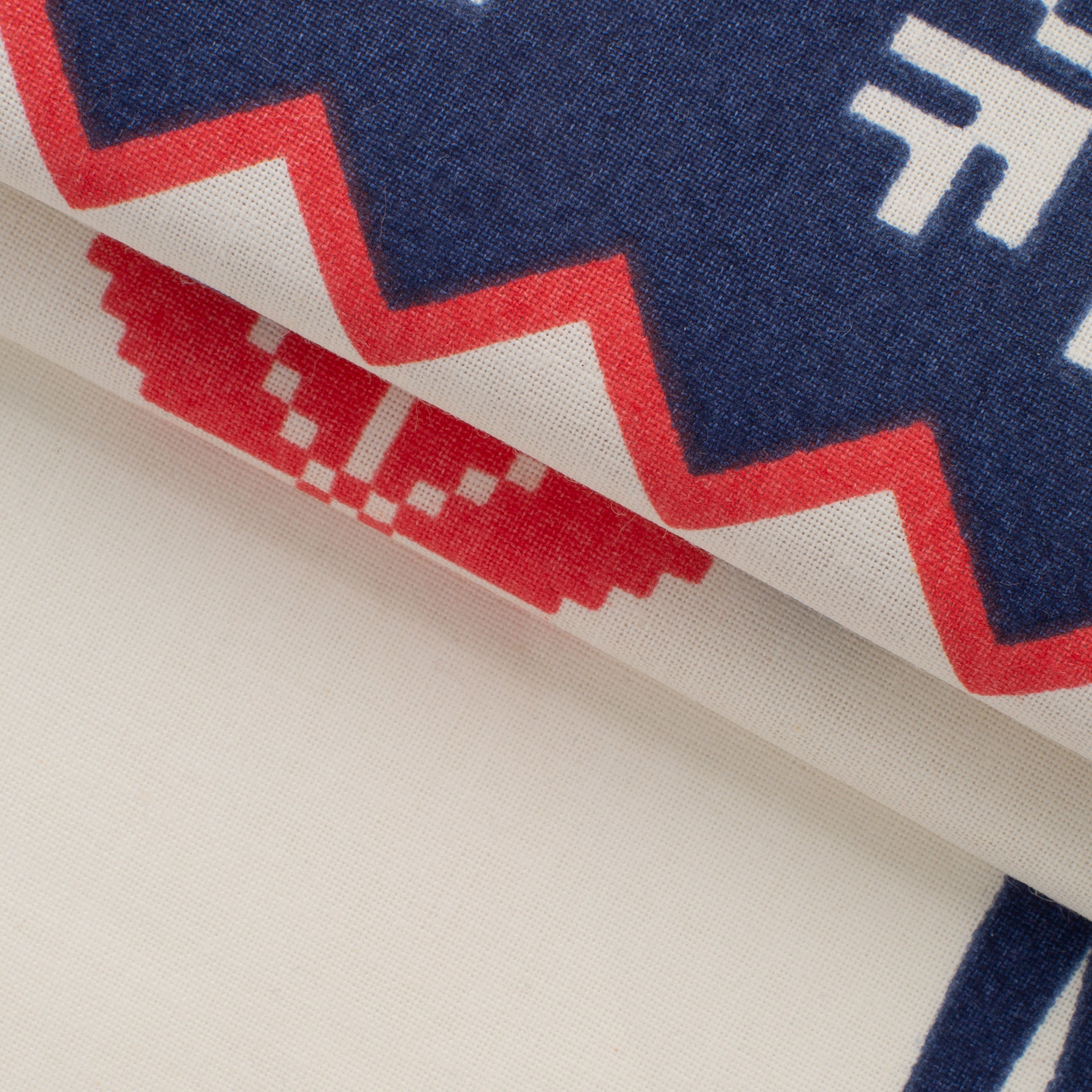 Fabric with a distinct Scandinavian-style winter pattern - navy blue reindeer, snowflakes and geometric motifs complemented by red accents on a cream background. Ideal for creating cozy decorations and textiles that will bring a festive atmosphere to the interior.