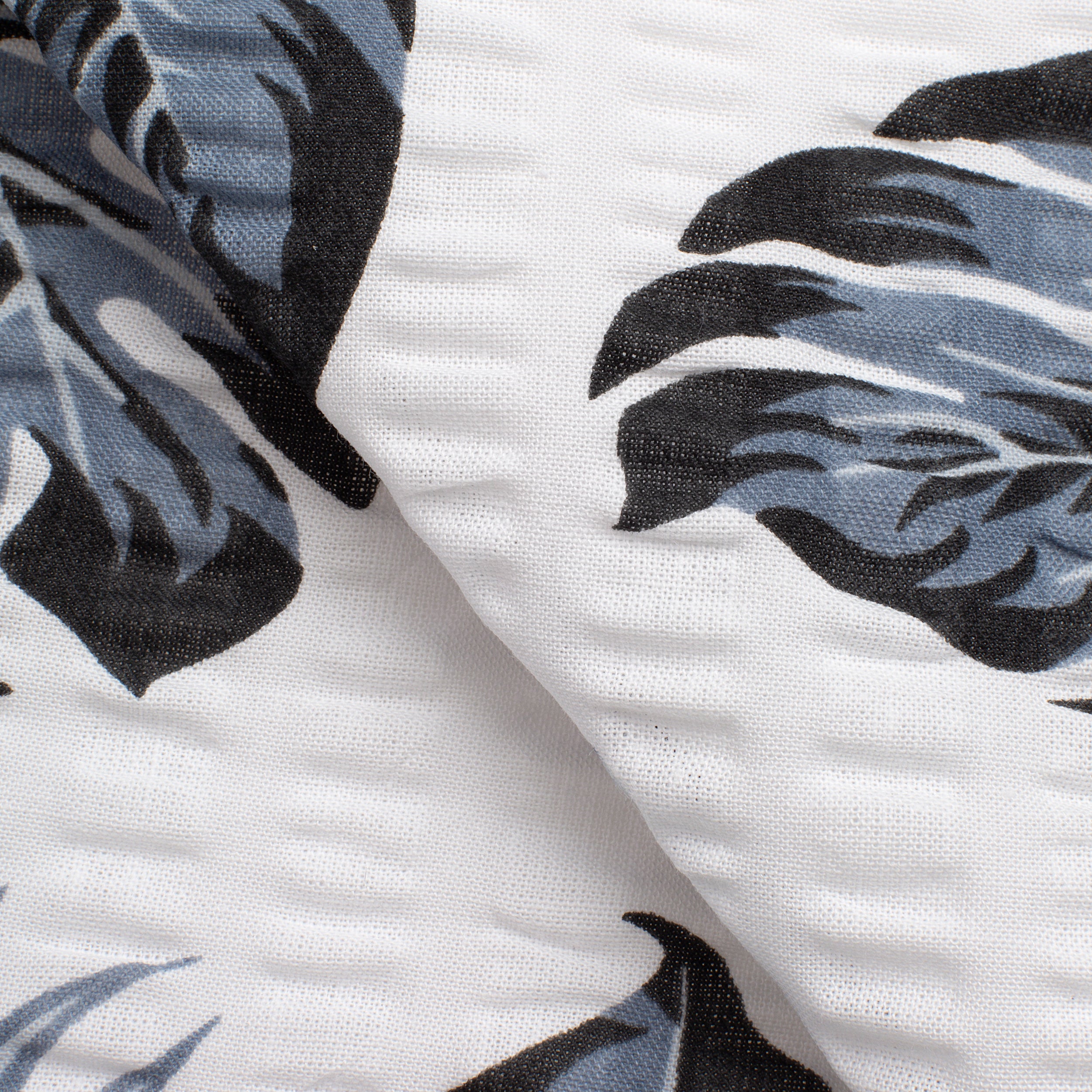 SEERSUCKER FABRIC - PRINTED - MONSTERA FLOWER fabric combines natural comfort with an elegant floral pattern in shades of blue and black on a white background. Made of 100% cotton, with a weight of 160 g/m2 and a density of 140, it is breathable, hypoallergenic and pleasant to the touch. The solid weave ensures durability and resistance to deformation, making it an ideal choice for heavy use.