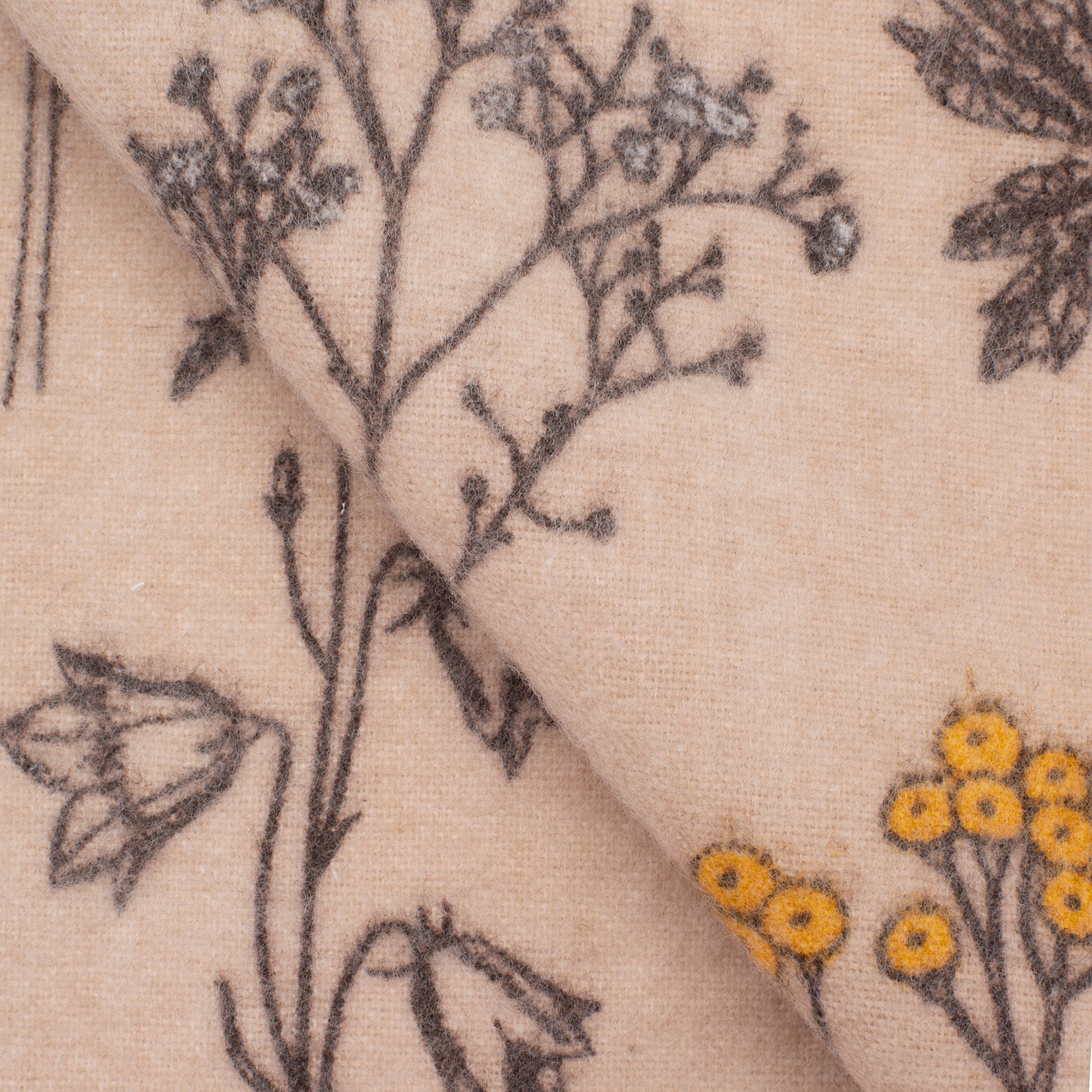 COTTON FLANNEL - PRINTED _ MEADOW BEIGE is a fabric with a warm beige background, decorated with delicate drawings of field flowers and plants in shades of graphite and subtle accents of yellow. This natural, muted pattern gives the fabric a rustic and cozy feel. Made of 100% cotton, with a weight of 160 g/m2 and a density of 150, it is breathable, hypoallergenic and exceptionally soft to the touch. The stable weave guarantees durability, resistance to deformation and ease of care.