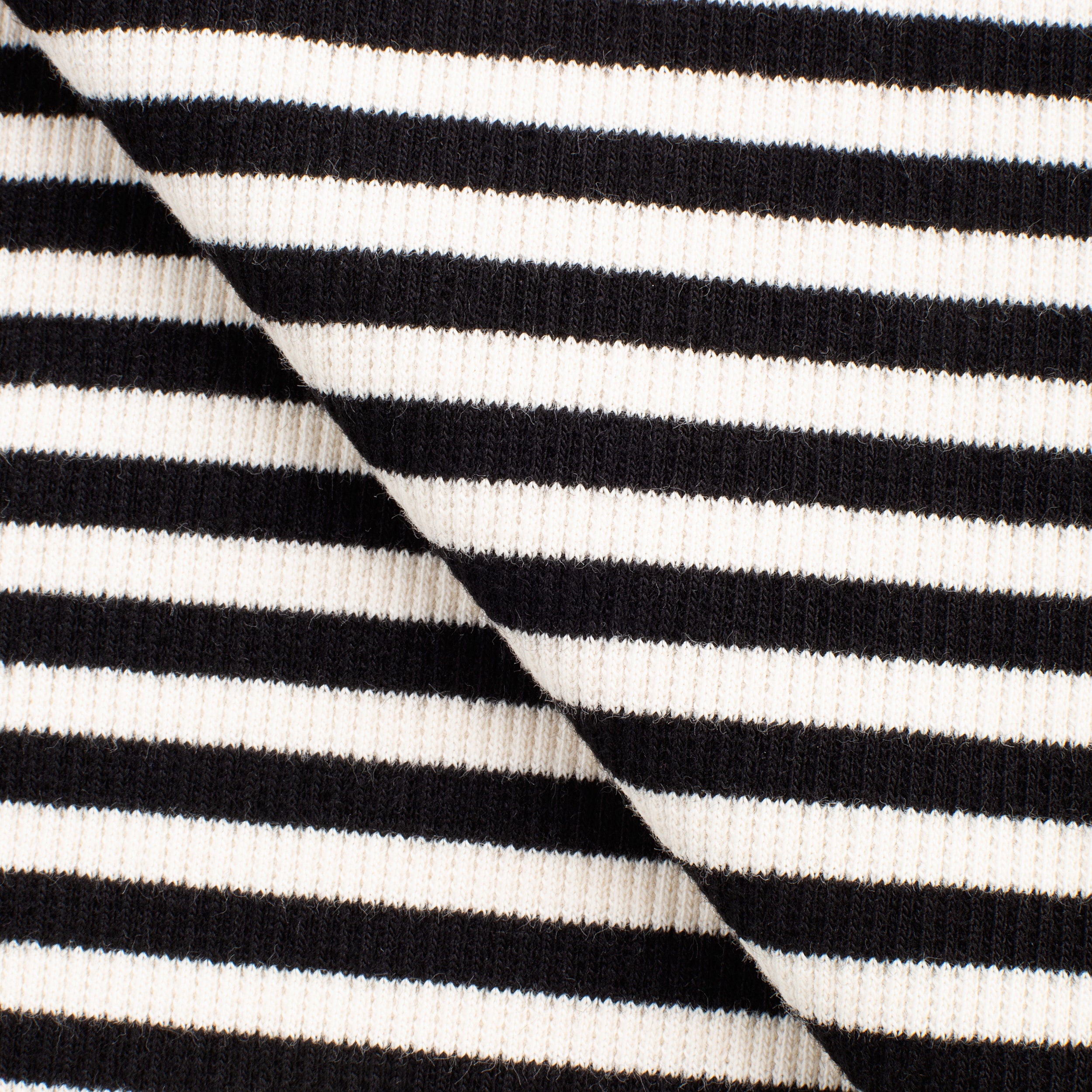 Add character to your projects with the 2 X 1 COTTON RIB fabric in timeless black and white stripes with an effect that gives it a subtle, slightly washed look. The classic pattern combined with the ribbed texture of the 2x1 rib knit fabric makes the fabric a perfect combination of style and functionality.