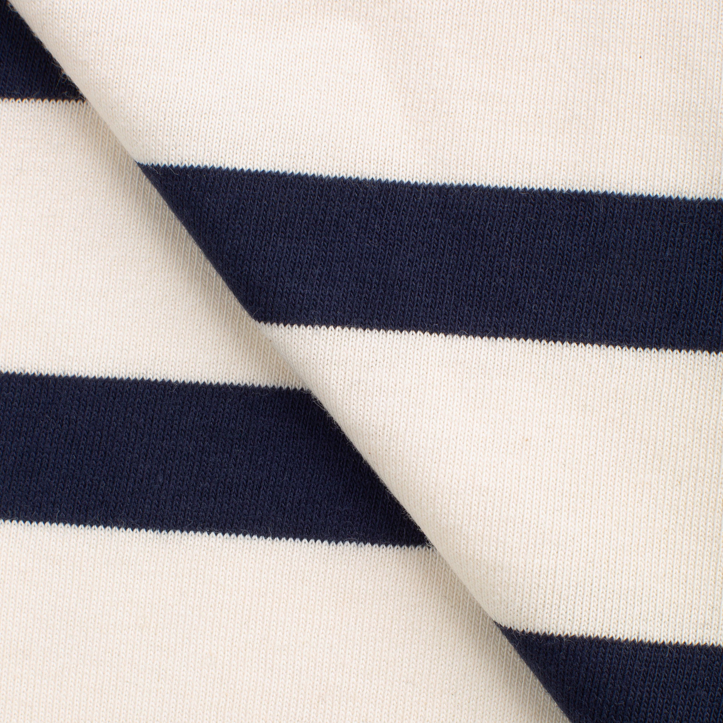 Introduce a touch of nautical elegance into your designs with the COTTON JERSEY fabric in navy blue and white stripes. This timeless pattern, combined with soft, natural cotton, makes the fabric ideal for both everyday wear and summer, lightweight creations in a resort-wear climate.